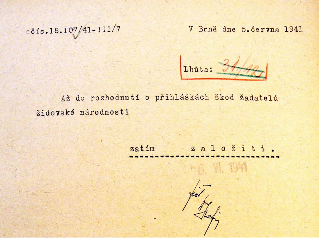 Poznámka o založení žádosti na židovských přihláškách, r. 1941