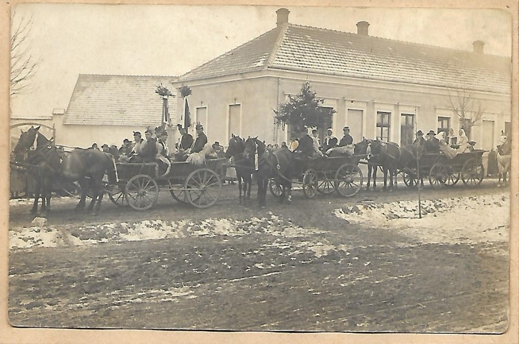 Svatební průvod se stromem a „sulicí“, Lanštorf (Ladná). 1905